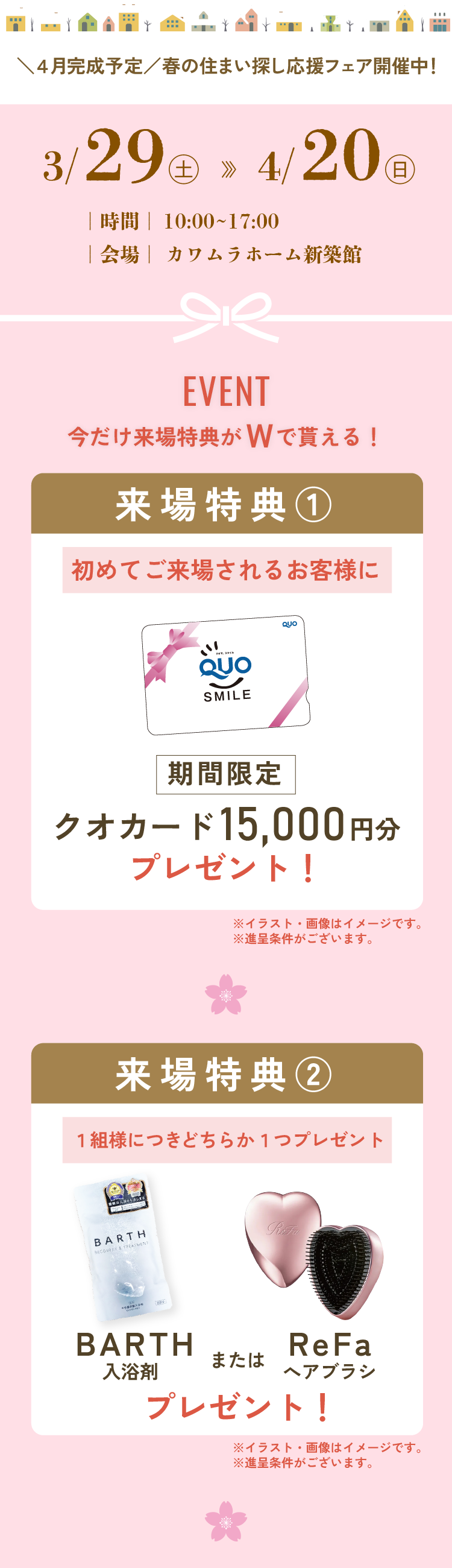 ・同居のご家族様を含め、複数ブランドにご来場いただいた際の複数回の進呈はできません。(カワムラホームグループ ラクイエ・ライトハウス・リムハウス・カウイエ)